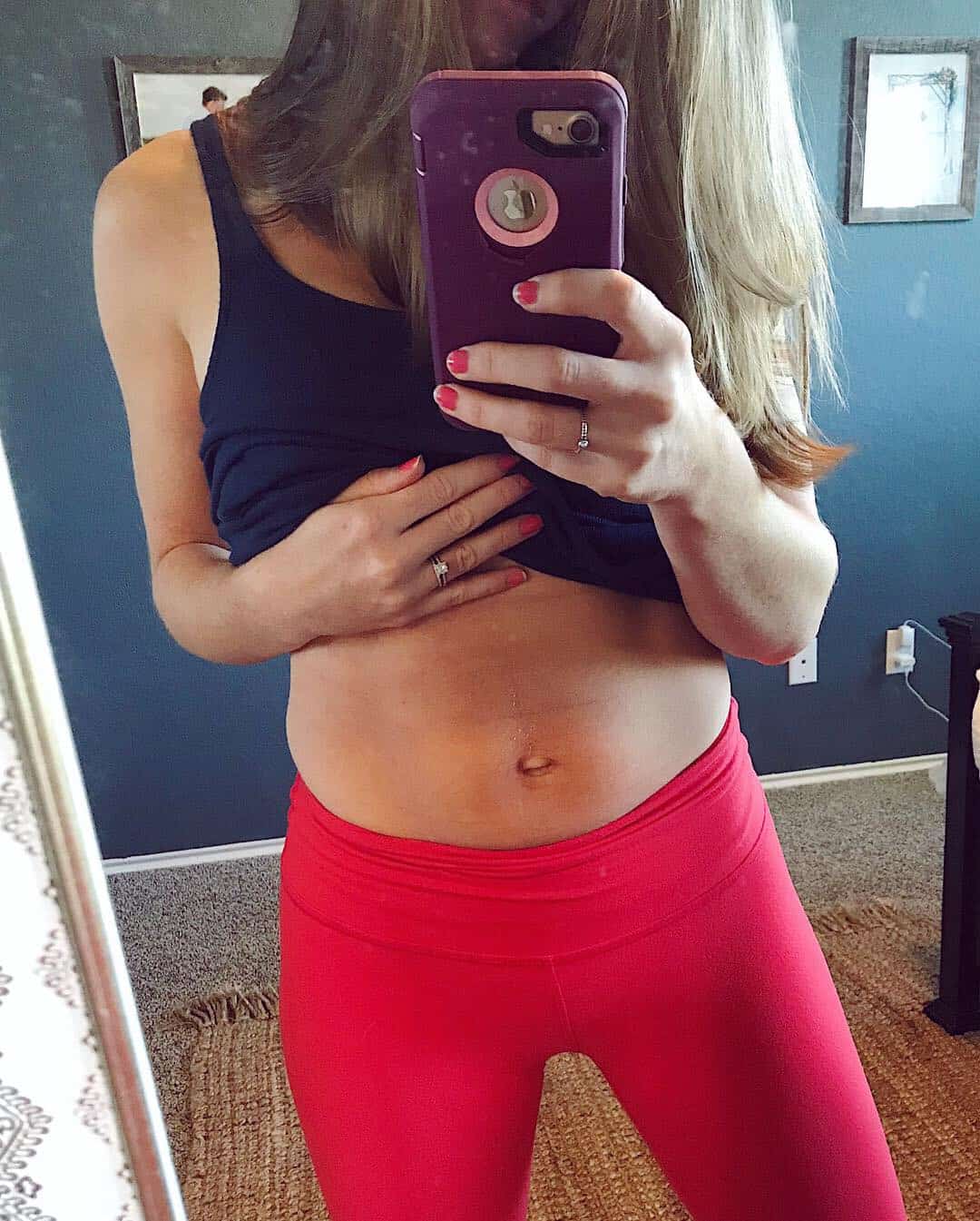 - Belly Belt – I started wearing this belly belt the day after Brooks was born and wore it every day/night for the two weeks after that. I swear it helped squeeze everything back together. Here’s my biology teacher way of thinking about it: Toward the end of your pregnancy and shortly after, your body produces excess amounts of the hormone “Relaxin” which allows your bones and ligaments to loosen up so they can spread apart to make room for baby. Once your body stops this excess production of relaxin, the ligaments and bones will settle somewhat back into their normal spot but of course do not make it all the way back to the tight frame they used to hold. This was the benefit of the belly belt in those early weeks – to synch everything back up while the relaxin still allowed all those loose parts to move with added force. Except instead of moving them apart further, the belt was guiding them back together! I’m no doctor, but from what I understand about the body, this makes sense. I was able to slip into a pair of jeans 5 days post partum that didn’t come close to fitting over my hips before giving birth, so I believe it worked! There are lots of belly belts that prove to be the best, but when deciding which one I wanted I went with one that focused on adding pressure on the hips to help guide all those parts back into place. My goal with the belly belt was not to temporarily “suck everything in” or “give a smooth appearance”, it was instead to try and coerce my abdominal wall and ligaments back together, and I needed more than a stretchy fabric tube for that! I chose this 3-in-1 belt because it was cost-effective and appeared to check these boxes. I even used the “pelvis belt” in the few weeks before Brooks was born to help with the SPD pain I had (highly recommend if you are suffering from this as well). I will use it again! (Pictured below is 2 weeks Postpartum and 4 weeks Postpartum – I swear the belly belt made a difference!)