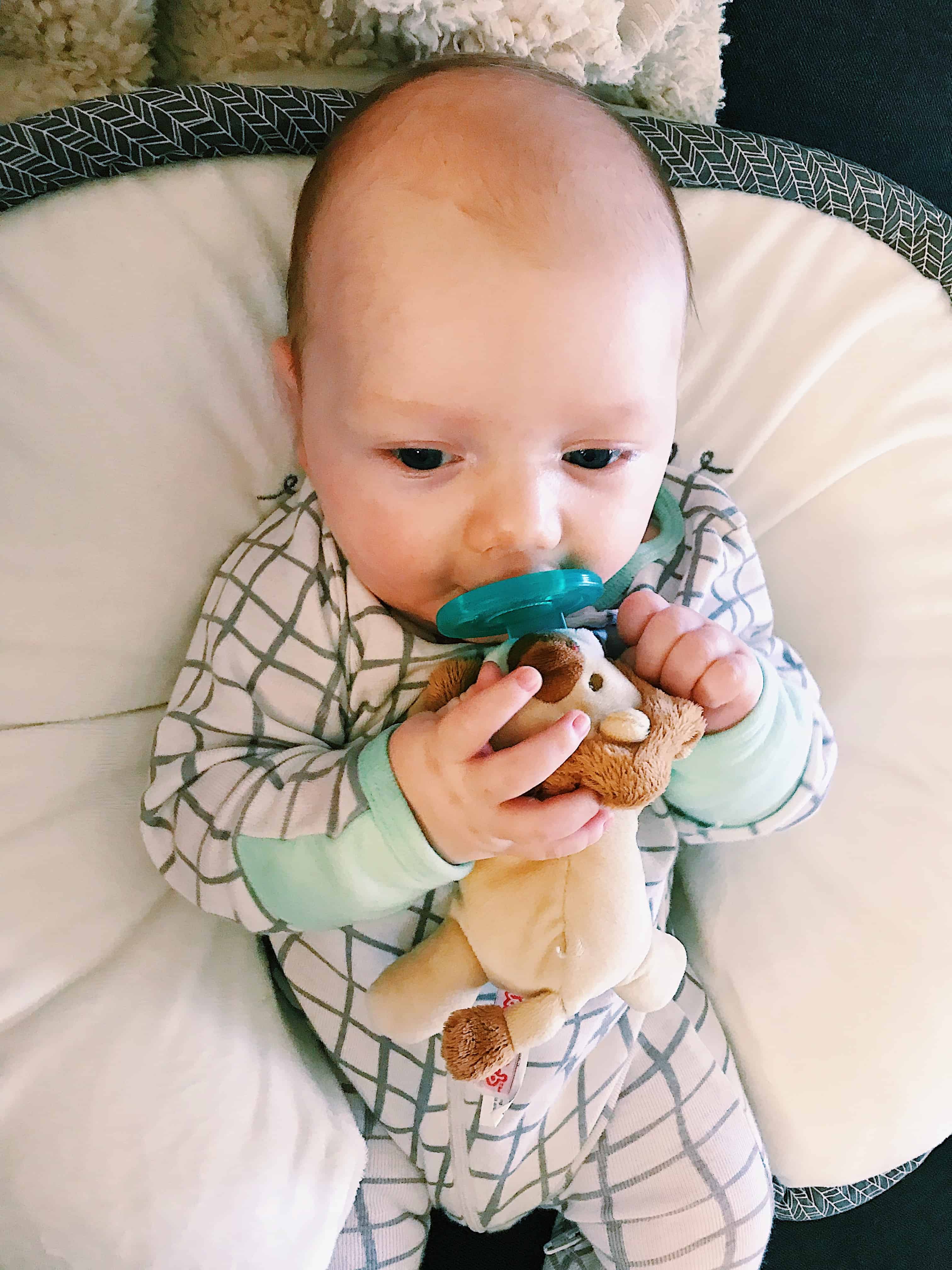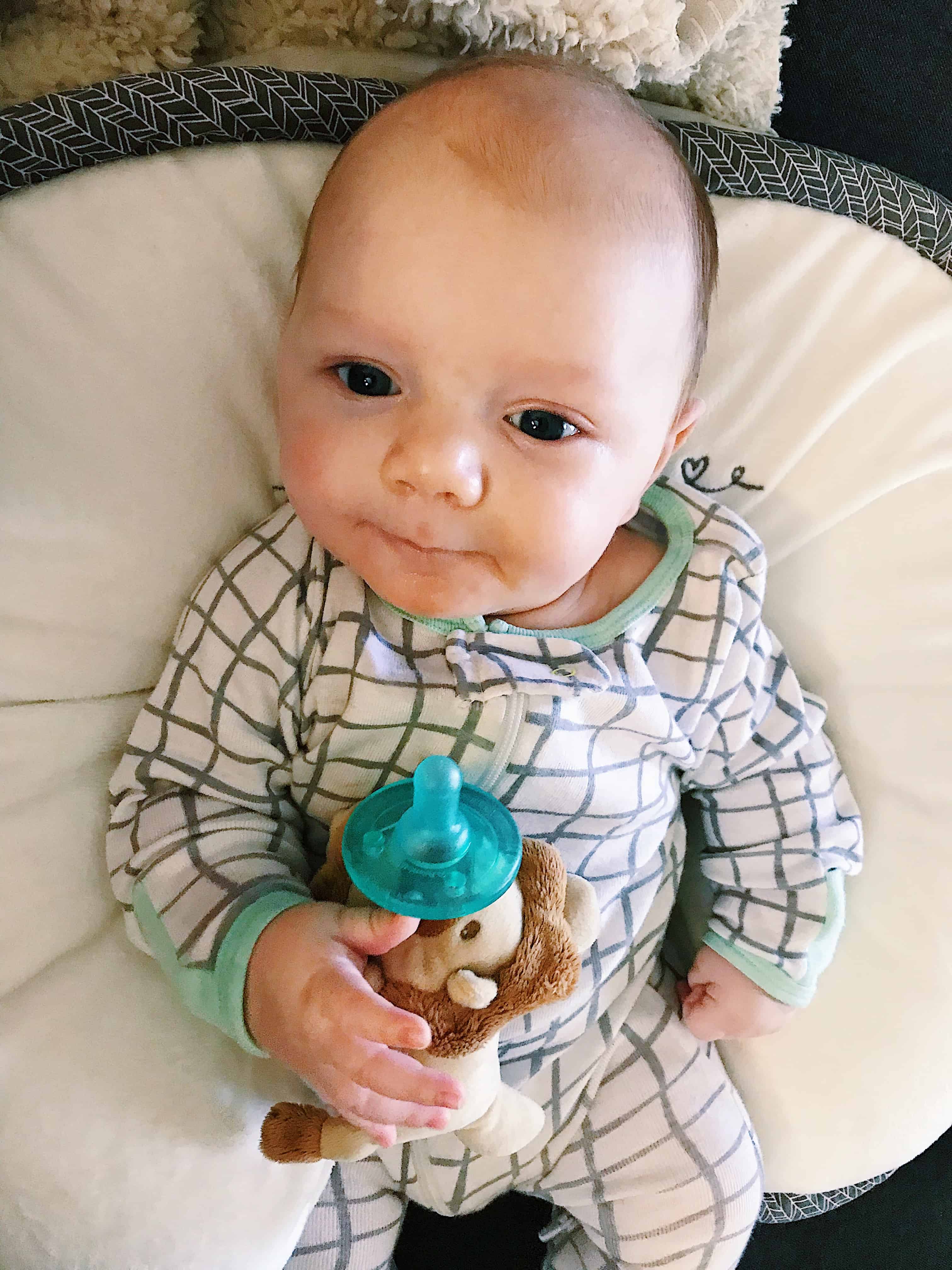- Boppy Pillow – In the first month this was my “everything pillow”. Nursing, holding Brooks while he slept, giving me free hands while keeping him tucked on my lap, it is just so adaptable! As we enter the 4th month, this pillow is now our favorite way to prop Brooks up on the couch next to us or under his playgym. We’ve enjoyed having him practice “tummy time” on it also! This pillow is a MUST for any new mom. I would recommend to spend the extra $10 on getting the “luxe” fabric pillow – it is MUCH softer than the traditional cotton and for as much use you’ll get out of it, it is absolutely worth it! (Another “must have” are these Wubbanub Binky’s – we call them all “Sebastian” and he LOVES them! I linked this cute lion one above!)