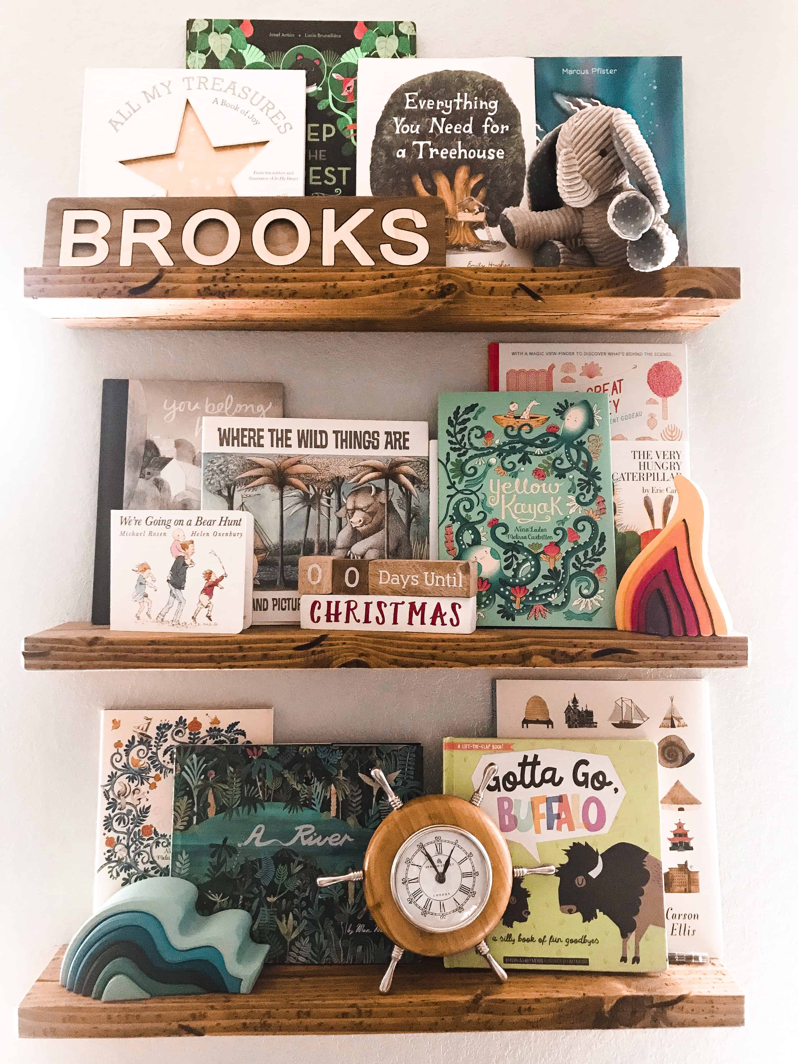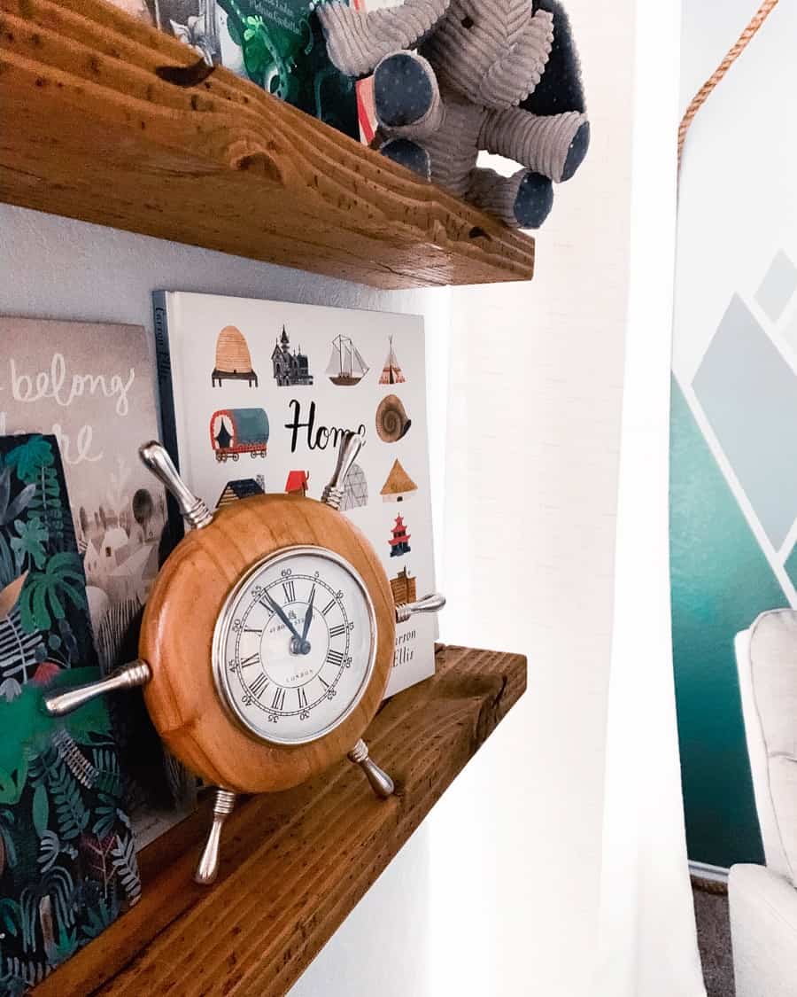 Above all, we wanted Brooks’ room to spark creativity and curiosity. We built a floating library gallery wall to proudly display his books as the MVP’s they are, refurbished a hand-made old rocking horse his dad once enjoyed, and hung a reading lamp on the end of a thick climbing rope in the corner. All of these things contribute to the excitement and curiosity we hope to inspire in him as he grows into this space, but what really ties it all together is the mountain mural.