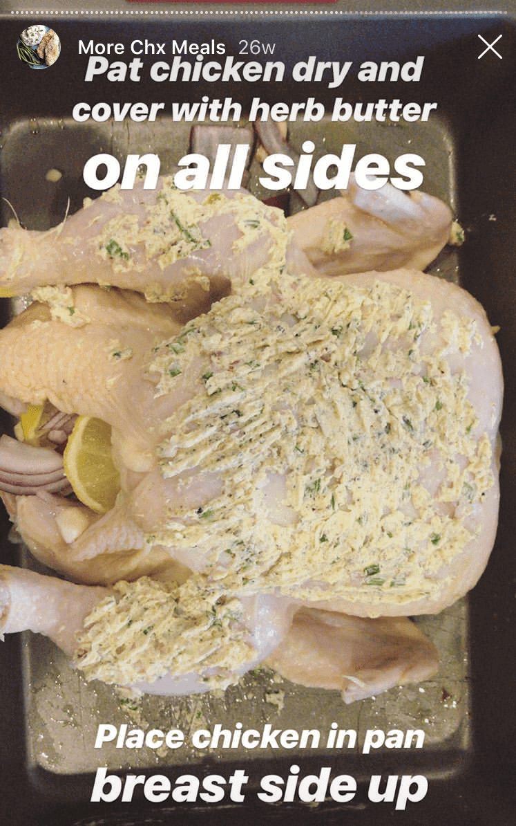 - Prepare your herb butter by combining all the ingredients in a small bowl. Then, use a spoon to coat the entire chicken with this herb butter (making sure to spread the butter above AND beneath the skin on the top of the chicken)! You do not have to coat the belly because the butter will drip down to the pan and flavor the underside.